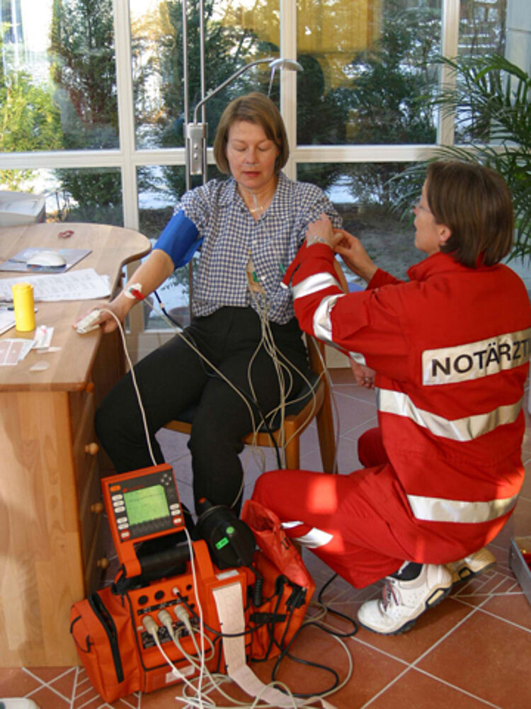 Ich spiele zusammen mit dem Deutschen Roten Kreuz einen Not-Fall. Ich werde einen Herz-Infarkt haben.